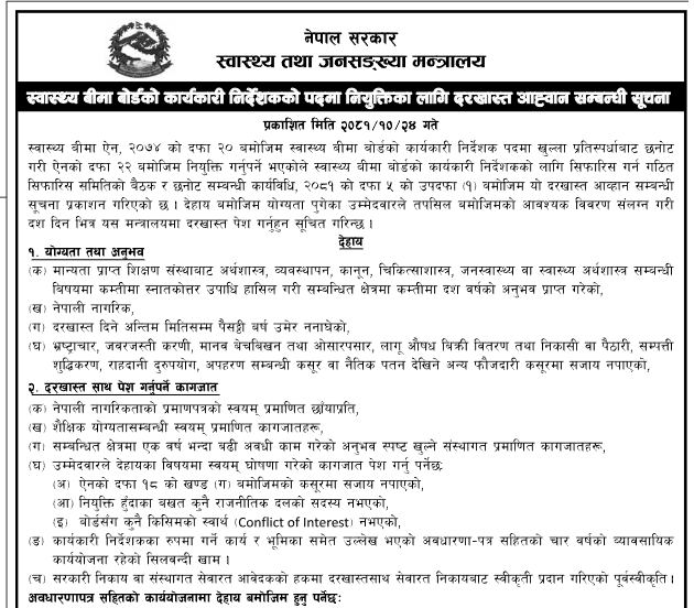 काठमाडाैं- स्वास्थ्य बीमा बोर्डको कार्यकारी निर्देशकका लागि दरखास्त आह्वान भएको छ । स्वास्थ्य मन्त्रालयद्वारा गठित सिफारिस समितिले बिहीबार दरखास्त आह्वान गरेको हो ।