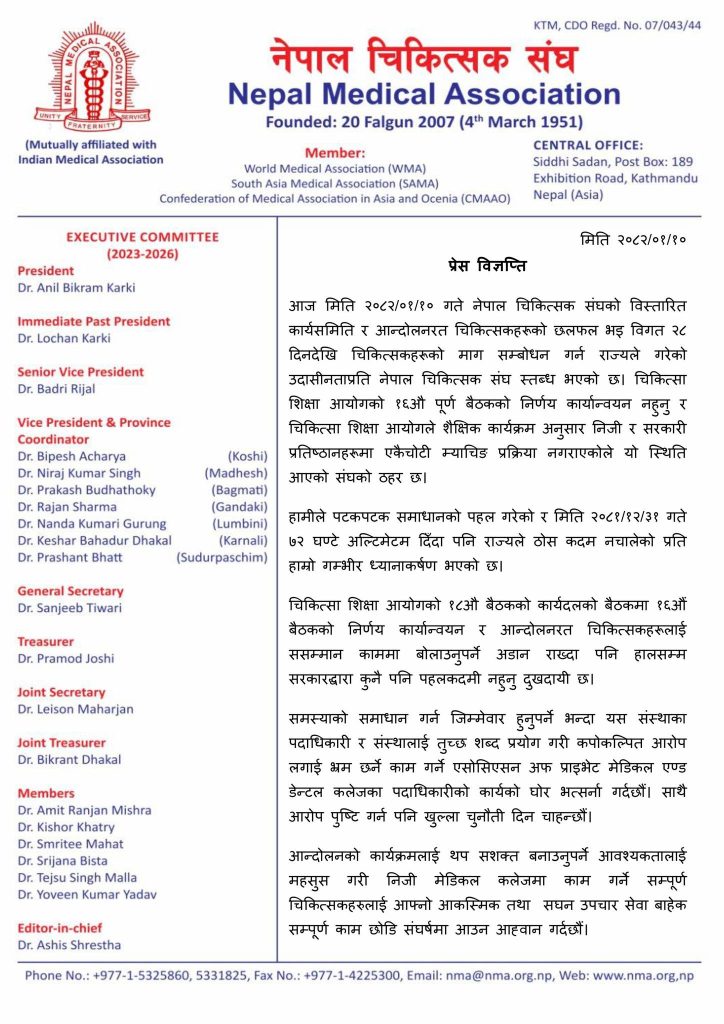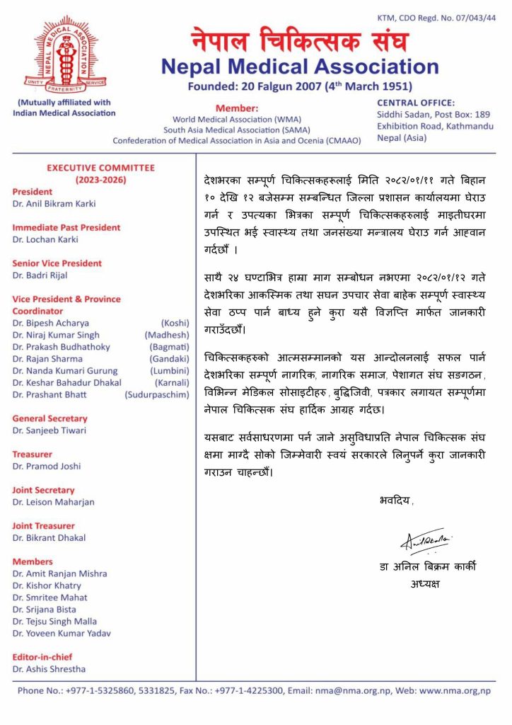 ‘चिकित्सकहरूको आत्मसम्मानको संरक्षणका लागि सुरू गरिएको यस आन्दोलनमा देशभरका नागरिक, नागरिक समाज, पेशागत संघसंस्था, बुद्धिजीवी, पत्रकार लगायत सबैको साथ र समर्थनको अपेक्षा छ ।’ अध्यक्ष डा. कार्कीले भने।