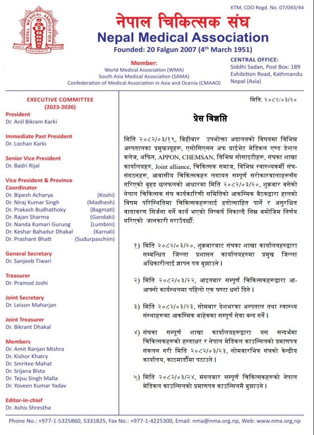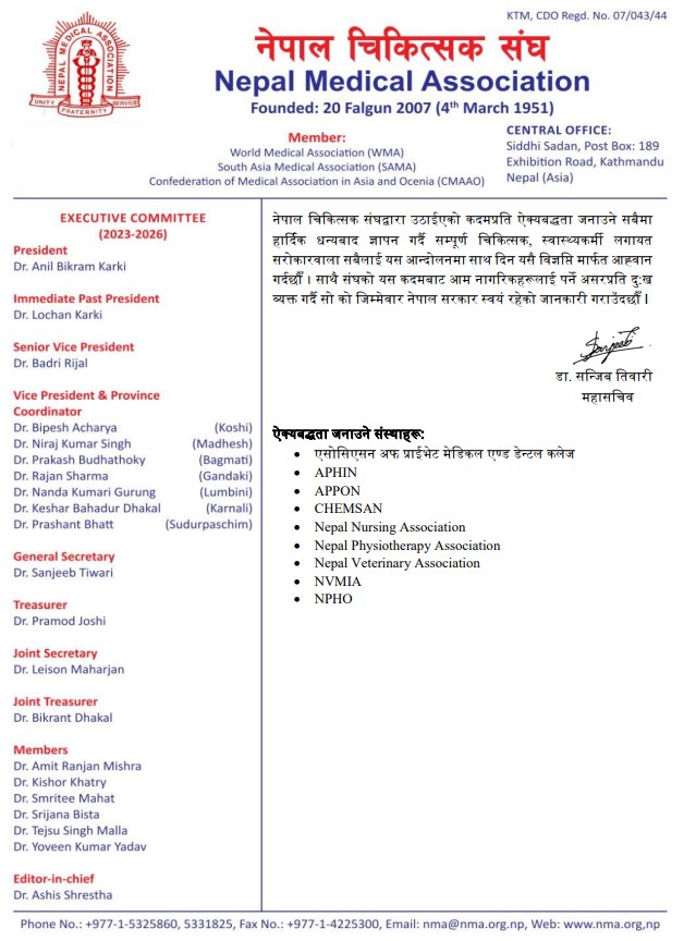 Kathmandu – Following a call by the Nepal Medical Association (NMA), all hospitals and health institutions across Nepal have suspended all services except for emergency care starting today (Monday).